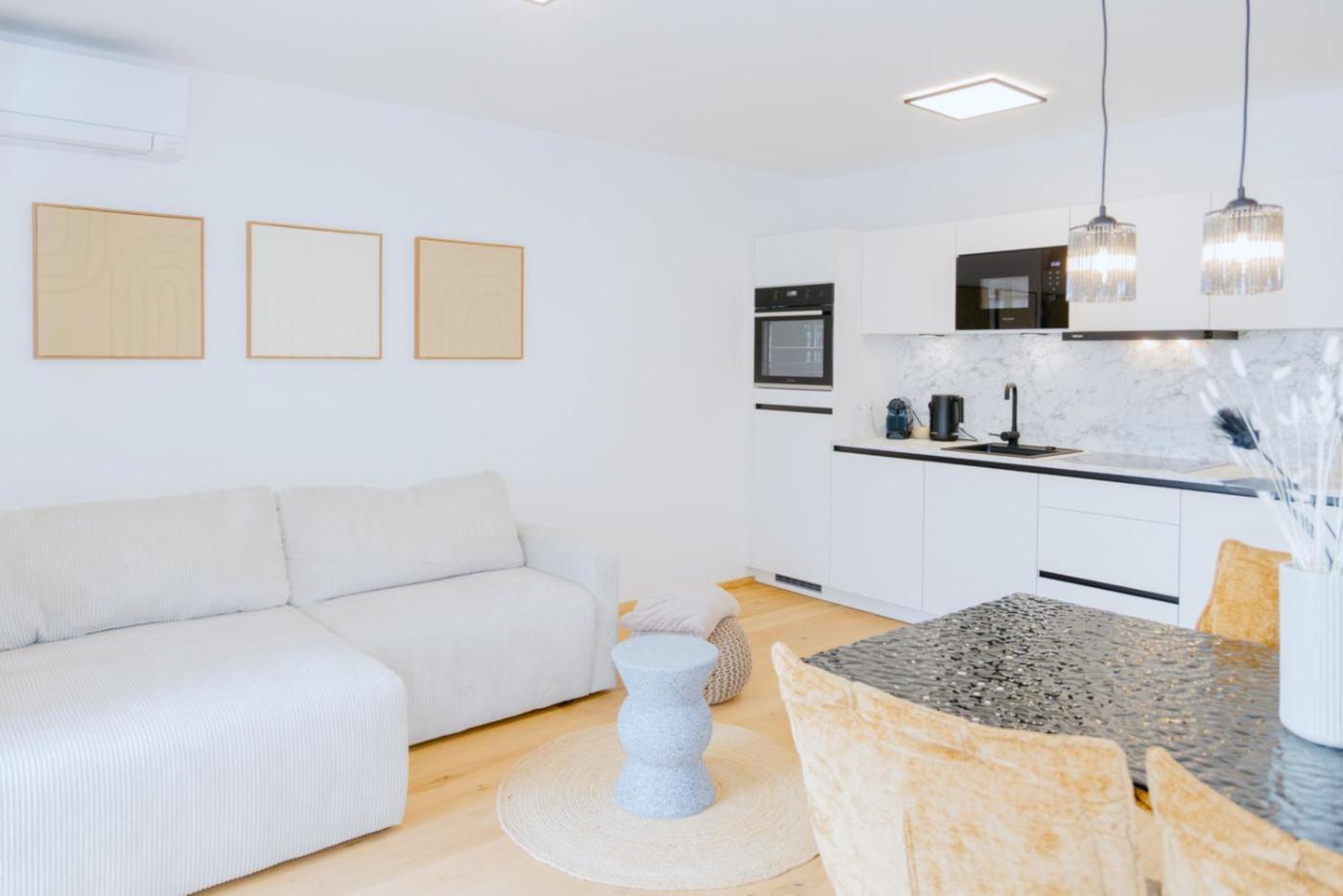 Two-Bedroom Apartment. Featuring 2 bedrooms, this spacious apartment offers 1 bathroom with a shower, a seating area and terraceyou can relax. The well-equipped kitchen features a stovetop, a refrigerator, a dishwasher and kitchenware. The air-conditioned apartment provides a flat-screen TV, a washing machine, soundproof walls, a coffee machine as well as lake views. The unit has 2 beds. ;