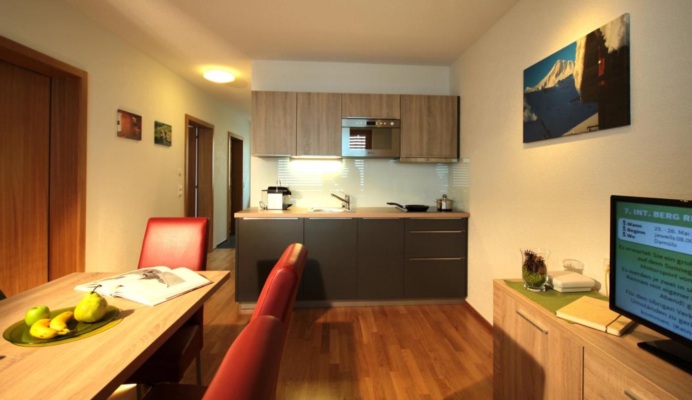 All houses are built with larch wood with Swiss stone pine furnishings. Apartments in the main building offer luxurious oak furnishings. Each unit also has a flat-screen TV, living area and a fully equipped kitchen or kitchenette.