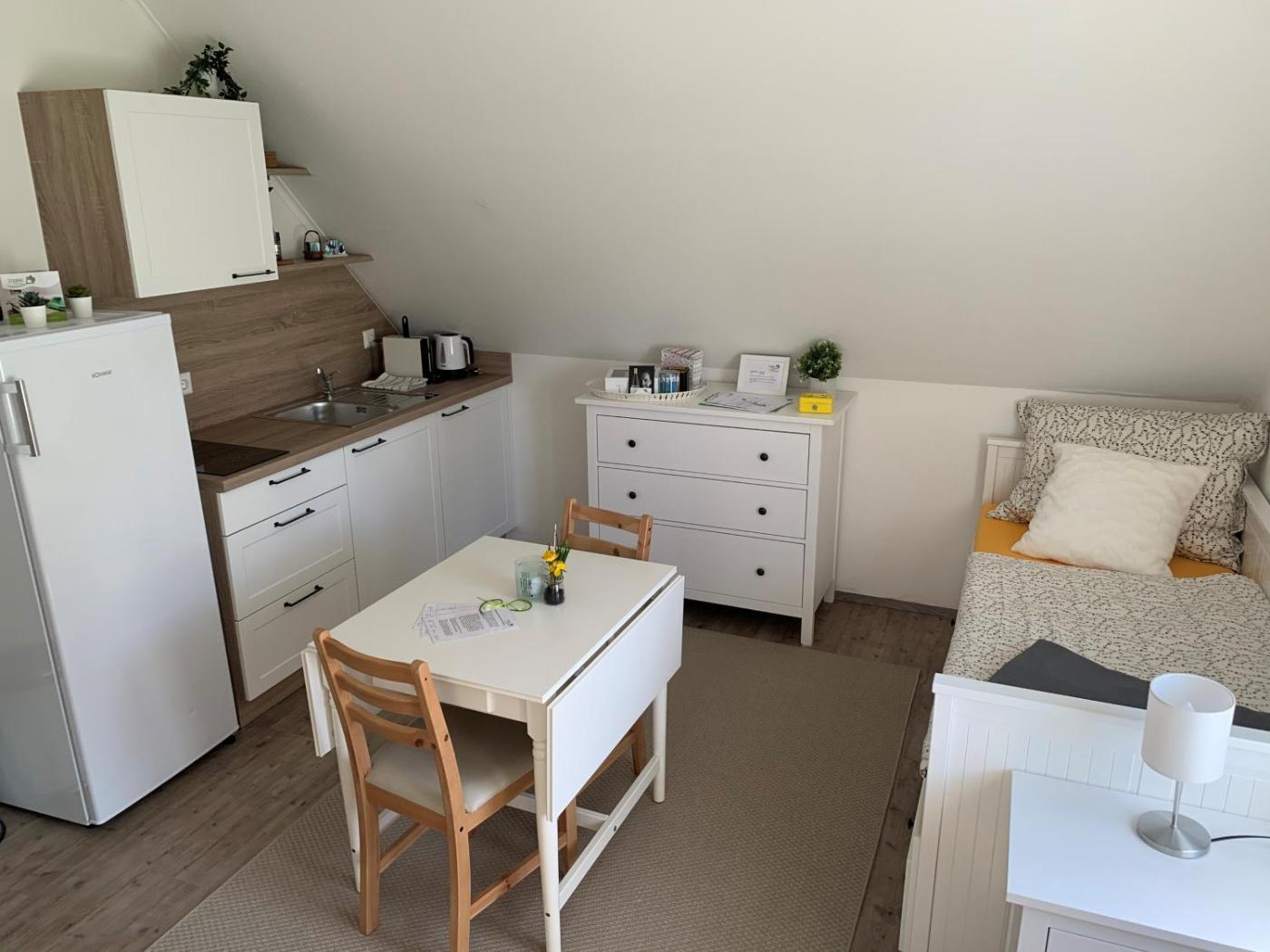 Każdy apartament posiada w pełni wyposażoną kuchnię, w której znajdują się przybory kuchenne, płyta kuchenna, lodówka, czajnik elektryczny oraz ekspres do kawy, co pozwala na przygotowywanie własnych posiłków i napojów ☕🍽️. W aneksie kuchennym znajduje się również pralka, dzięki której goście mogą wygodnie dbać o czystość swoich ubrań.