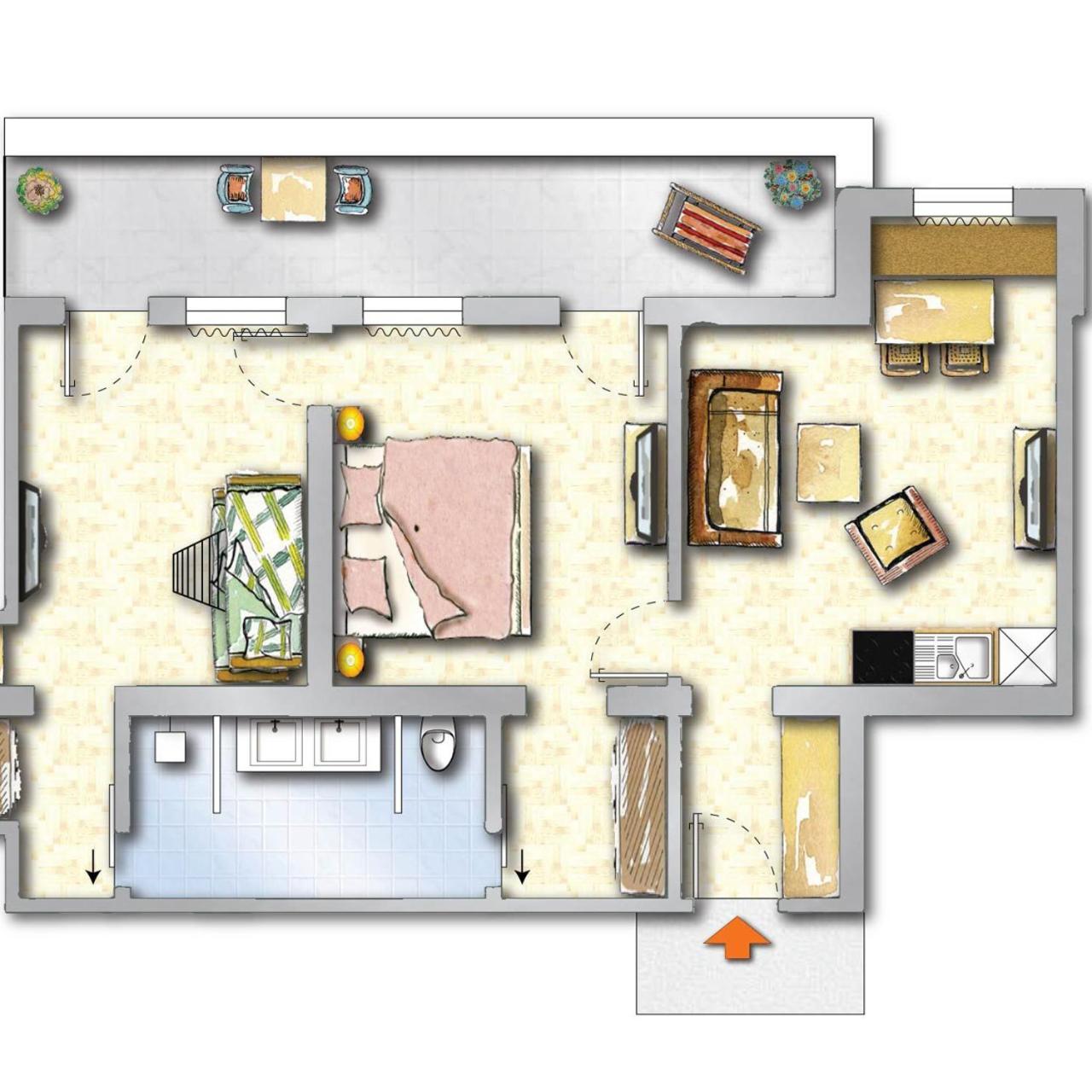 One-Bedroom Apartment. This apartment features a bedroom with a double bed, and a living room with a sofa bed as well as a bunk bed. ;