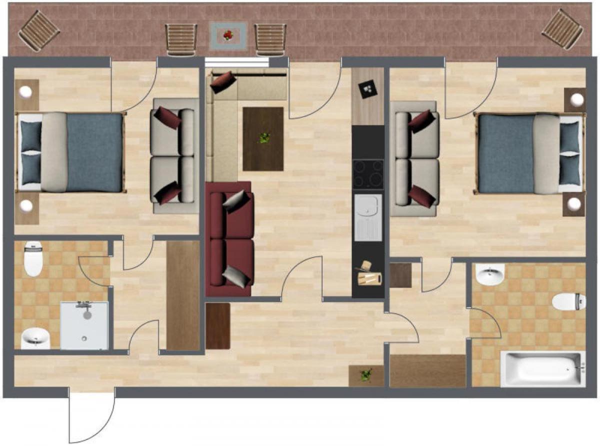 Deluxe Two-Bedroom Apartment with Balcony. Large apartment with - 2 bedrooms - 2 bathrooms - living room with fully equipped kitchen - big balcony accessible fromrooms - heating, electricity, linen and towels are included ;