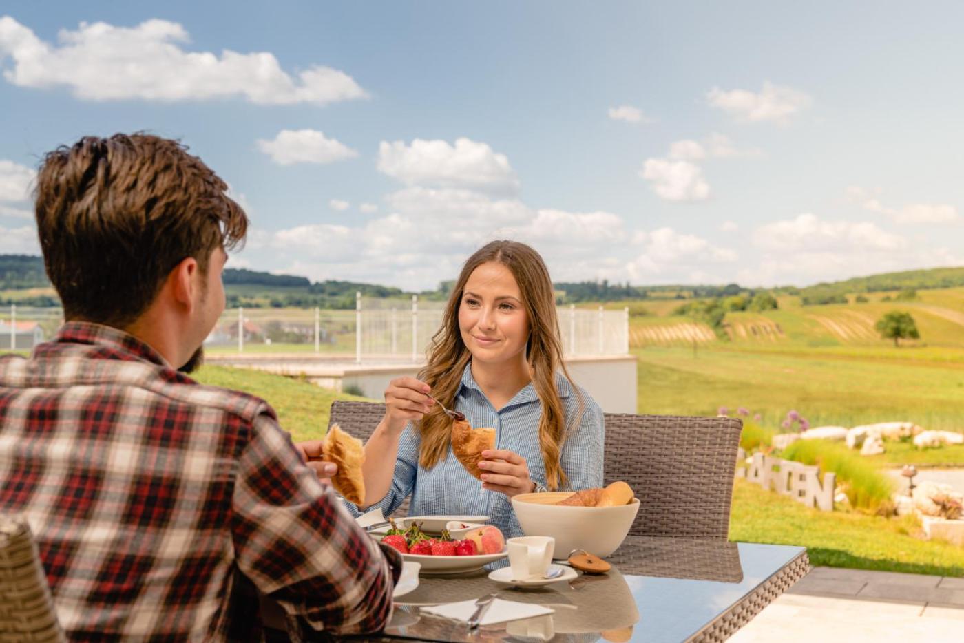 The property offers a covered sun terrace with views of the Leithagebirge and the vineyards, as well as a large garden with deck chairs, a regional breakfast buffet, and free WiFi access.