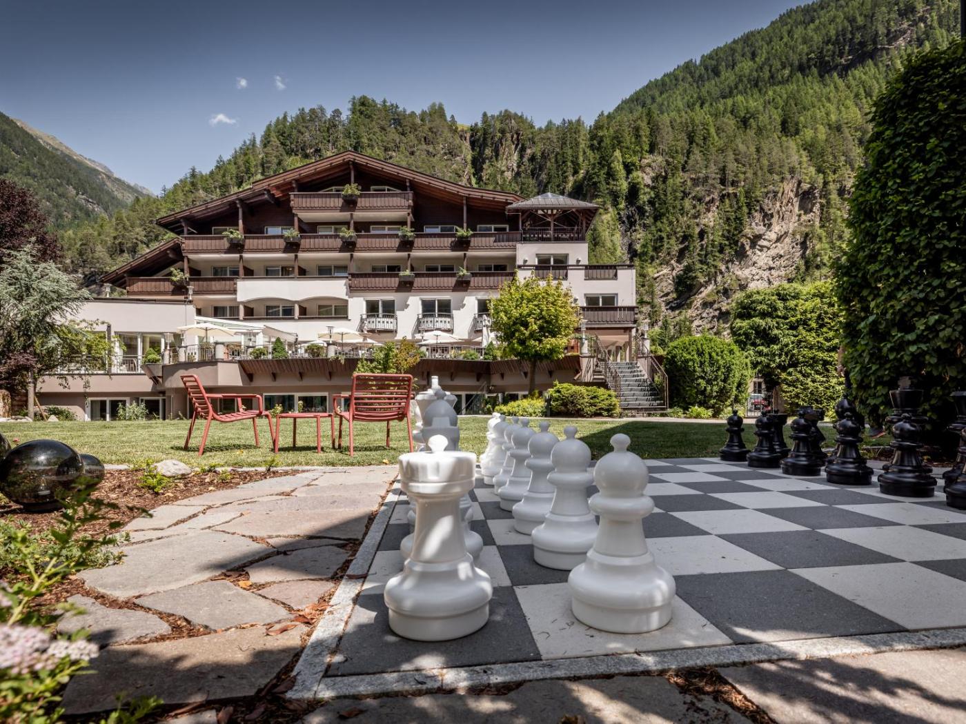 The wellness facilities include an indoor pool, a sauna area with steam baths, a sauna and a new pool in the garden with views of the alpine surroundings. Various beauty treatments and massages are available as well. Access to the spa area is included inrates.