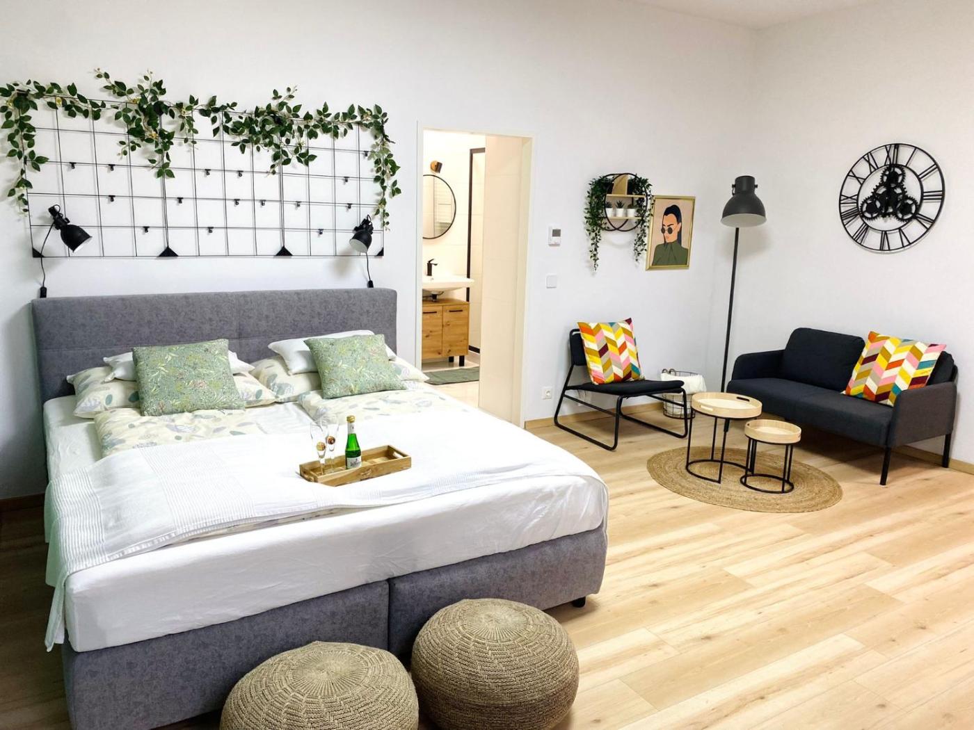 One-Bedroom Apartment. The air-conditioned apartment has 1 bedroom and 1 bathroom with a shower and a hairdryer. In the well-equipped kitchen, guests will find a stovetop, a refrigerator, kitchenware and an oven. This apartment features a tea and coffee maker, flat-screen TV with streaming services, garden views, as well as winechampagne for guests. The unit has 1 bed.