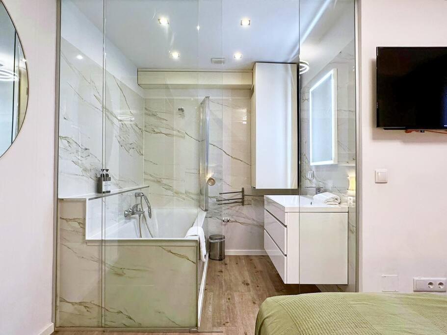 Apartment. This apartment is comprised of 1 living room, 1 separate bedroom and 2 bathrooms with a bath and free toiletries. In the well-fitted kitchen, guests will find a stovetop, a refrigerator, a dishwasher and kitchenware. This apartment is air-conditioned and features a seating area with a flat-screen TV, a tea and coffee maker, a dining area, a sofa, as well as parquet floors. The unit offers 3 beds.