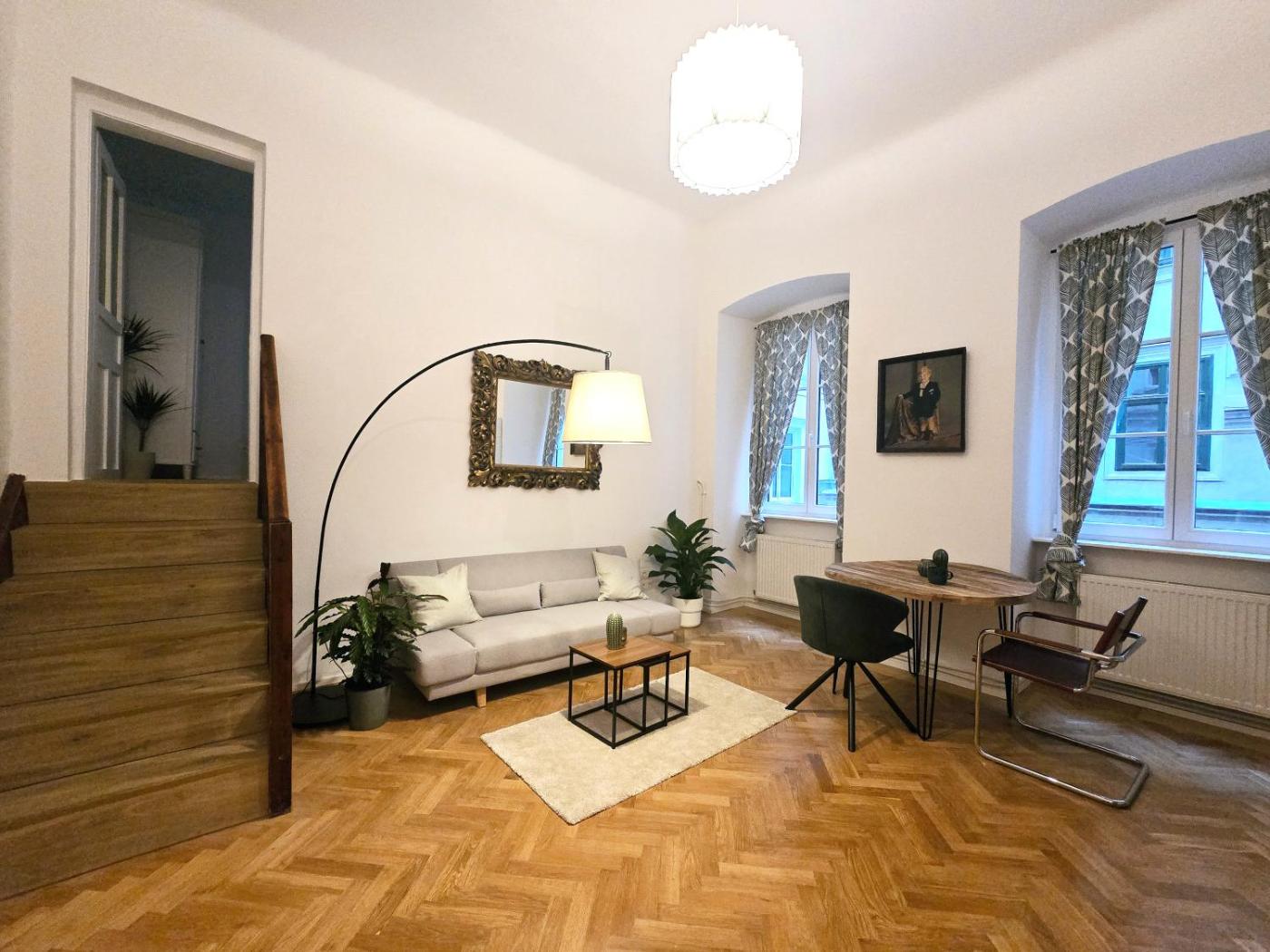 One-Bedroom Apartment. This apartment is comprised of 1 living room, 1 separate bedroom and 1 bathroom with a walk-in shower and free toiletries. In the fully equipped kitchen, guests will find a stovetop, a refrigerator, a dishwasher and kitchenware. The apartment features parquet floors, a seating area with a TV, a tea and coffee maker, a dining area as well as ancourtyard view. The unit offers 2 beds.