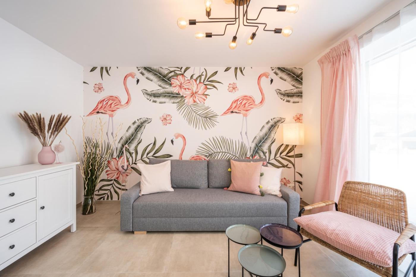 One-Bedroom Apartment. Featuring a private entrance, this apartment is comprised of 1 living room, 1 separate bedroom and 1 bathroom with a walk-in shower and a hairdryer. Guests can make meals in the kitchen that comes with a stovetop, a refrigerator, a dishwasher and kitchenware. Boasting a terrace with garden views, this apartment also offers a tea and coffee maker and a flat-screen TV with streaming services. The unit offers 2 beds.